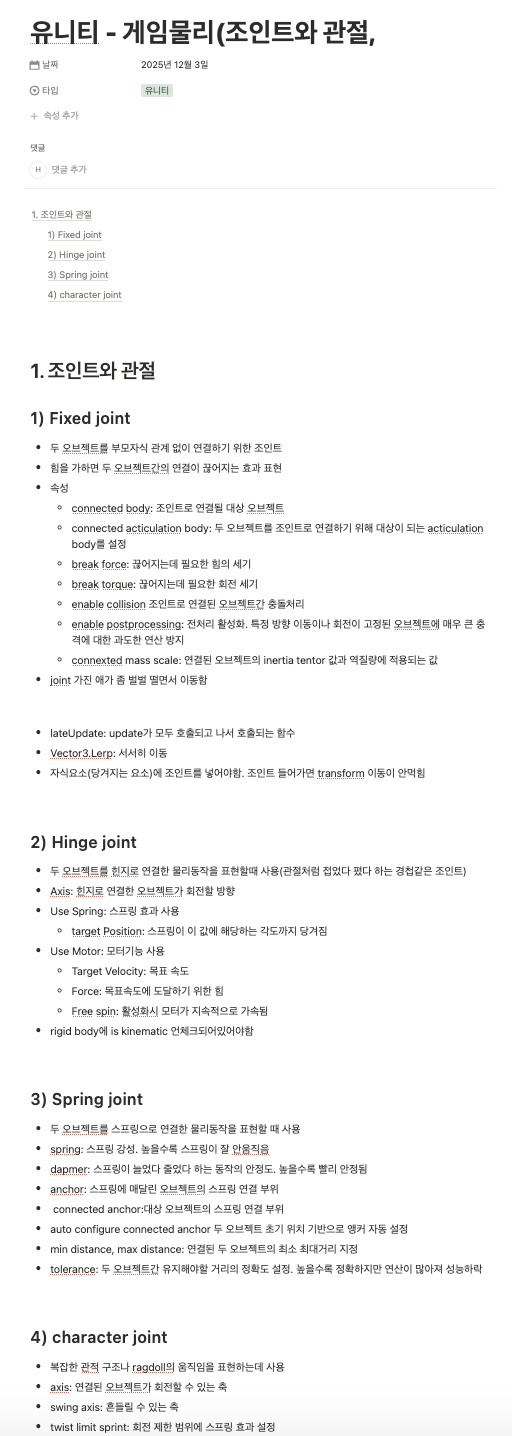유니티에 많은 조인트 컴포넌트가 있는데 그걸 한번 싹 훑어주셔서 넘 좋았다.