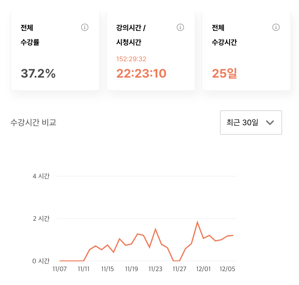 학습통계에 뭔가 오류가 있는데 11/26~11/27에 강의를 들었고 인증샷에도 강의 진행률이 올라간게 찍혔는데 수강시간이 0으로 찍혔다. 그래서 문의넣음ㅠㅠ